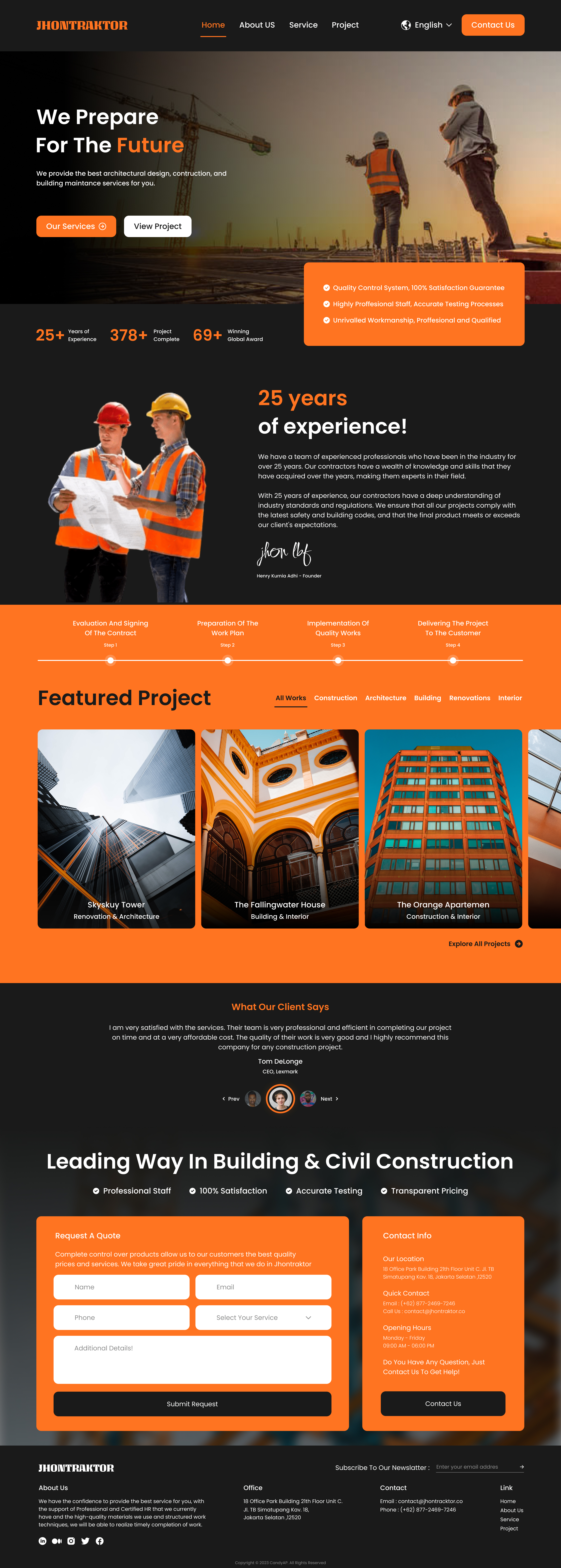 Jhontraktor is a professional services website designed to provide comprehensive solutions in architectural design, building maintenance, and construction. The platform is dedicated to offering a streamlined experience for clients seeking reliable services in the construction and infrastructure domain. It aims to bridge the gap between quality service providers and clients by offering a digital presence showcasing expertise, completed projects, and service details.